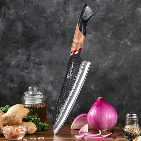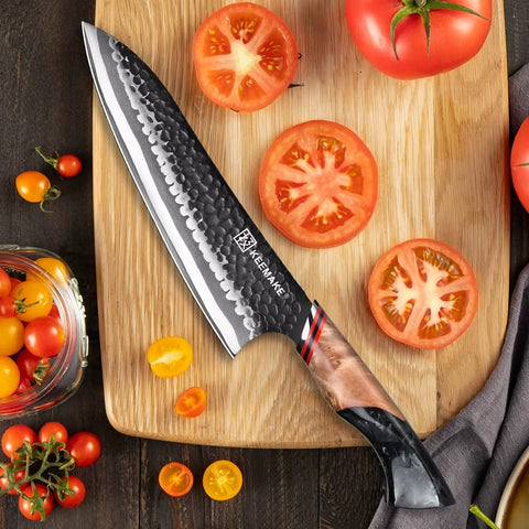 Use this 8 inch chef knife for meat slicing, fish slicing, fruit cutting, and vegetable cutting, because the edge is tuned for smooth, clean cuts. However, do not use it on bones or iced foods, since hard impacts can damage the edge. Finally, it arrives in a nice gift box, so it is ready for gifting.