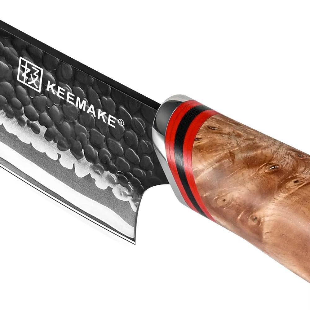 The ergonomic handle blends resin and G10, so it stays steady in the hand and supports precise control. Also, at 195 g net weight, the knife feels light enough for repetitive chopping without feeling flimsy. As a result, you can switch between rocking cuts and push cuts with better balance.