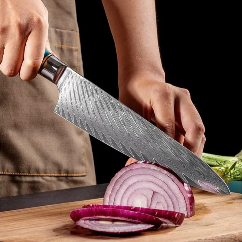 Each knife is built with a VG10 Vacuum Heat-Treated Japanese steel cutting core for extraordinary sharpness and long-lasting edge retention. The blade is wrapped in 67 layers of high-carbon stainless Damascus steel, providing outstanding strength, stain resistance, and minimal slicing friction.